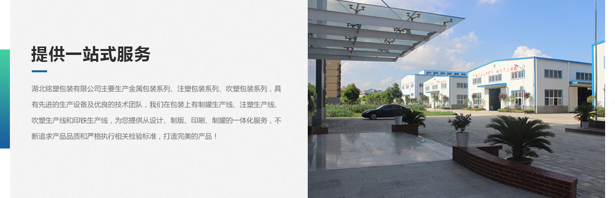 湖北銘塑包裝有限公司一家集研發(fā)、生產、銷售于一體的較優(yōu)秀民營企業,技術力量雄厚,產品質量可靠。位于交通暢順,百業興旺、經濟富裕、政策開放的孝感開發(fā)區域。我們企業的營銷戰(zhàn)略是以建筑為土壤,以產品為種子,以質量為肥料,讓綠色鋪滿全球。憑借多年來的行業經驗,公司不斷進行創(chuàng)新和研發(fā),為市場提供更廣泛的產品應用領域和更好環(huán)保節(jié)能產品,為國家能源環(huán)保戰(zhàn)略和可持續(xù)發(fā)展戰(zhàn)略作出應有的貢獻。     湖北銘塑包裝有限公司主要生產金屬包裝系列、注塑包裝系列、吹塑包裝系列,具有先進的生產設備及優(yōu)良的技術團隊,我們在包裝上有制罐生產線、注塑生產線、吹塑生產線和印鐵生產線,為您提供從設計、制版、印刷、制罐的一體化服務,不斷追求產品品質和嚴格執(zhí)行相關檢驗標準,打造更好的產品!